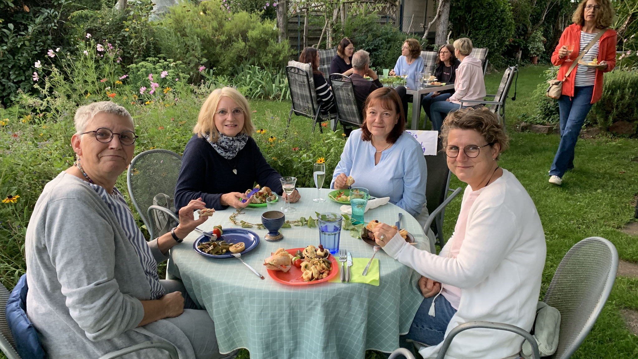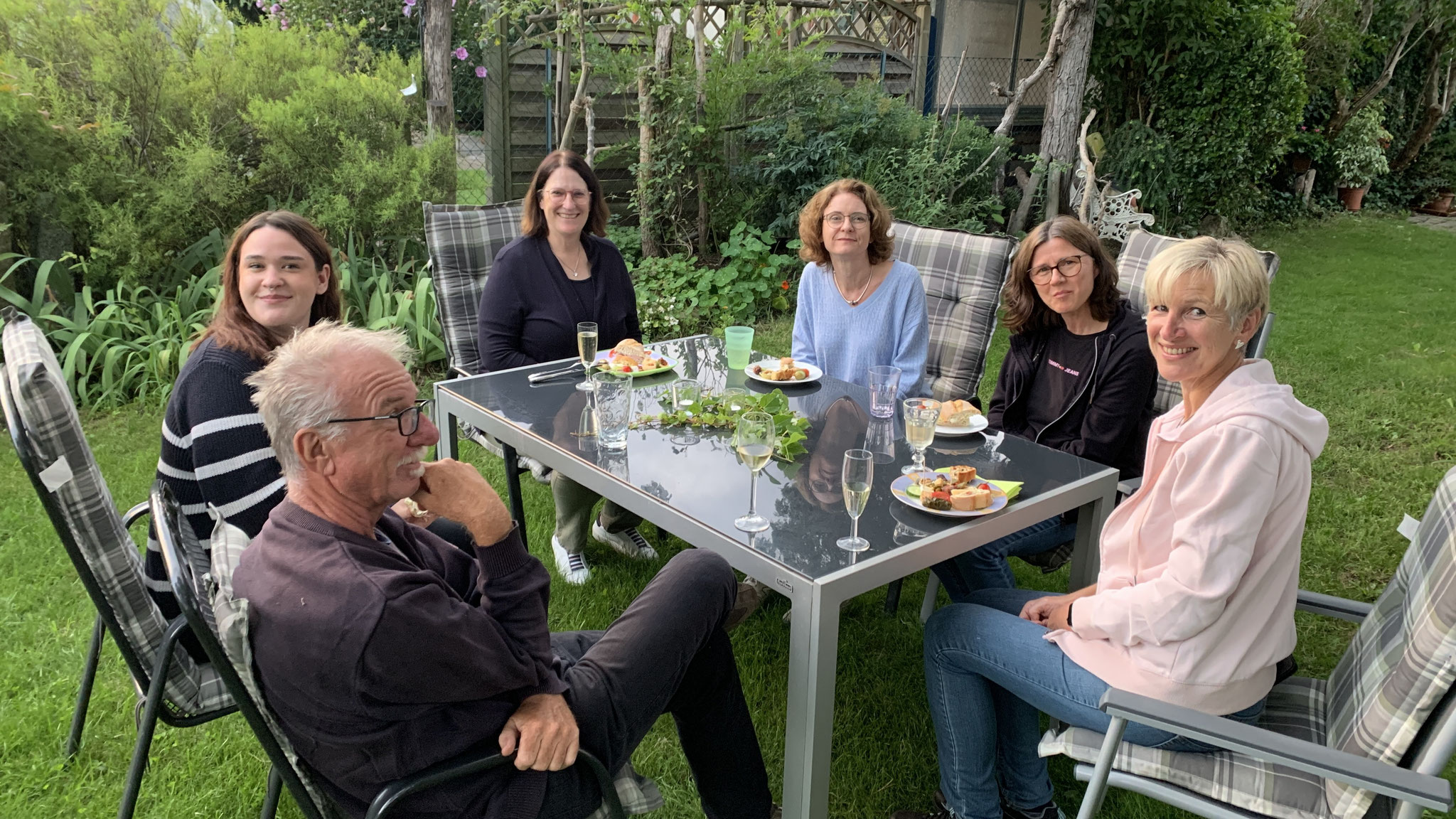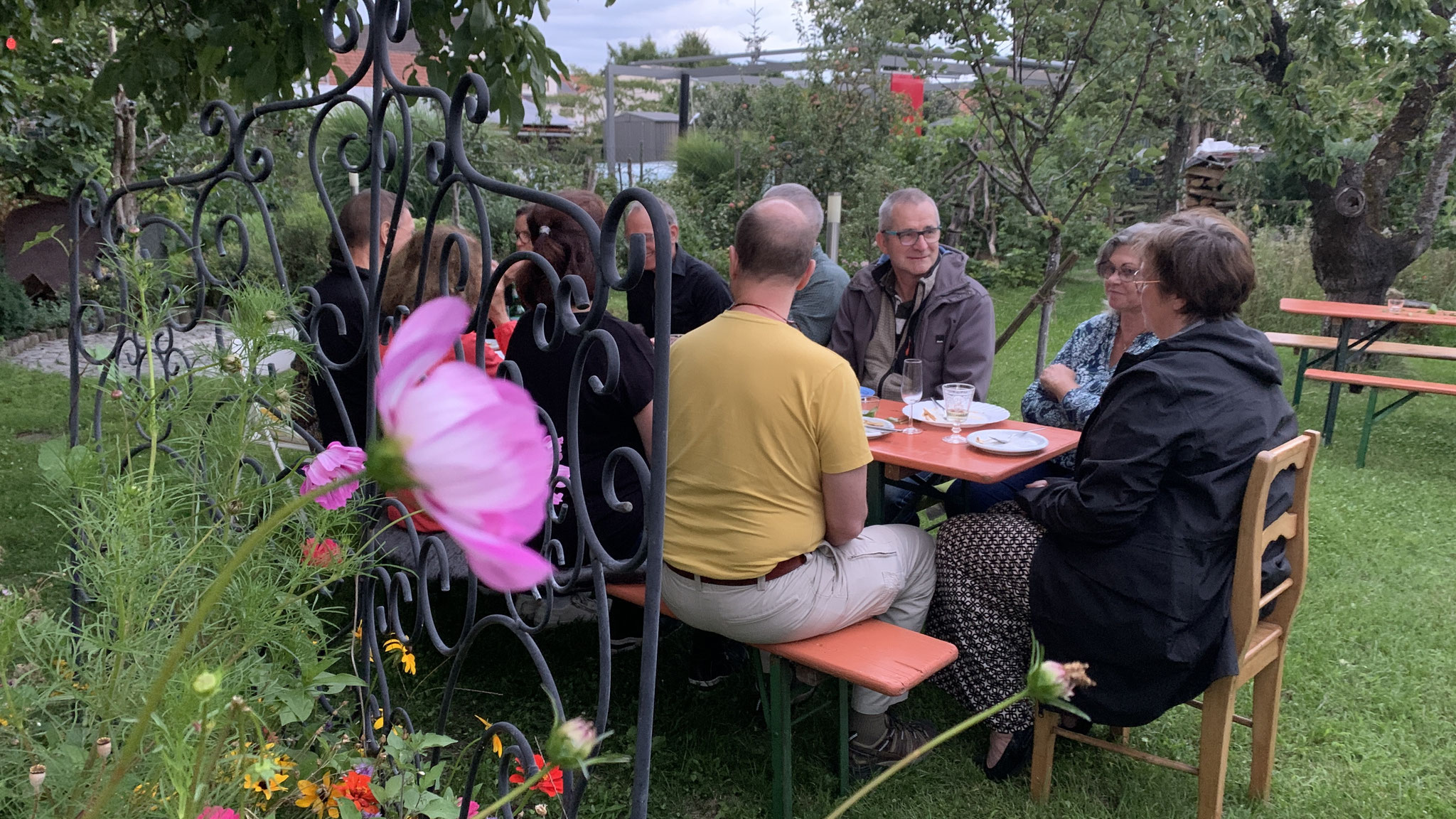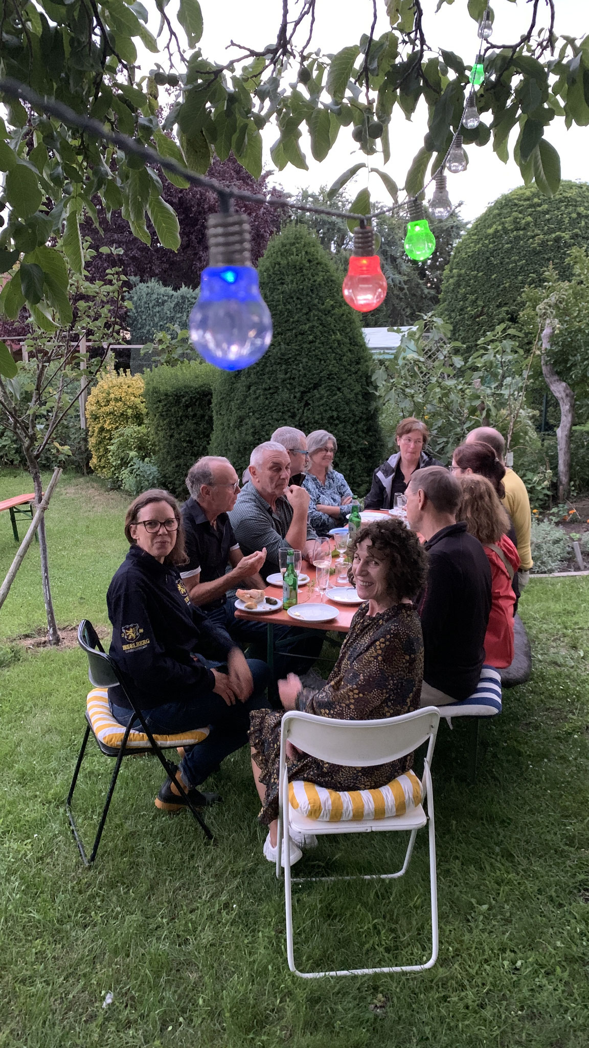Auf dem Ofen-Grill wurde noch herzhaft Fleischiges gegrillt und anschließend die Flammkuchen kurz und heiß gebacken. An einer großen Tafel auf der Terrasse durften wir die herrlichen Speisen alle bei bestem Spätsommer Wetter genießen. Natürlich wurden auch verschiedene Lieder angestimmt und zum Besten in gemütlicher Runde gegeben.