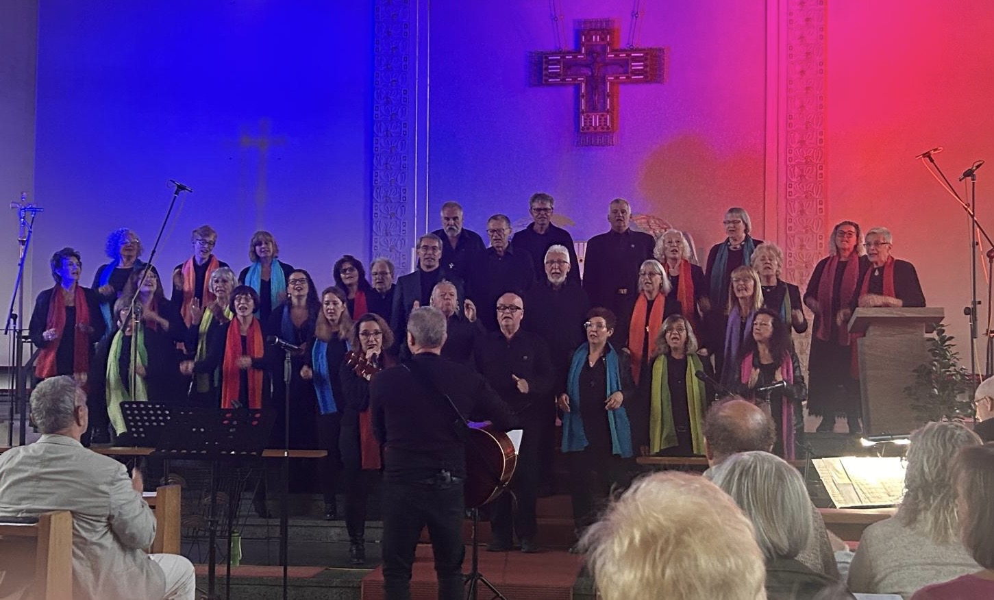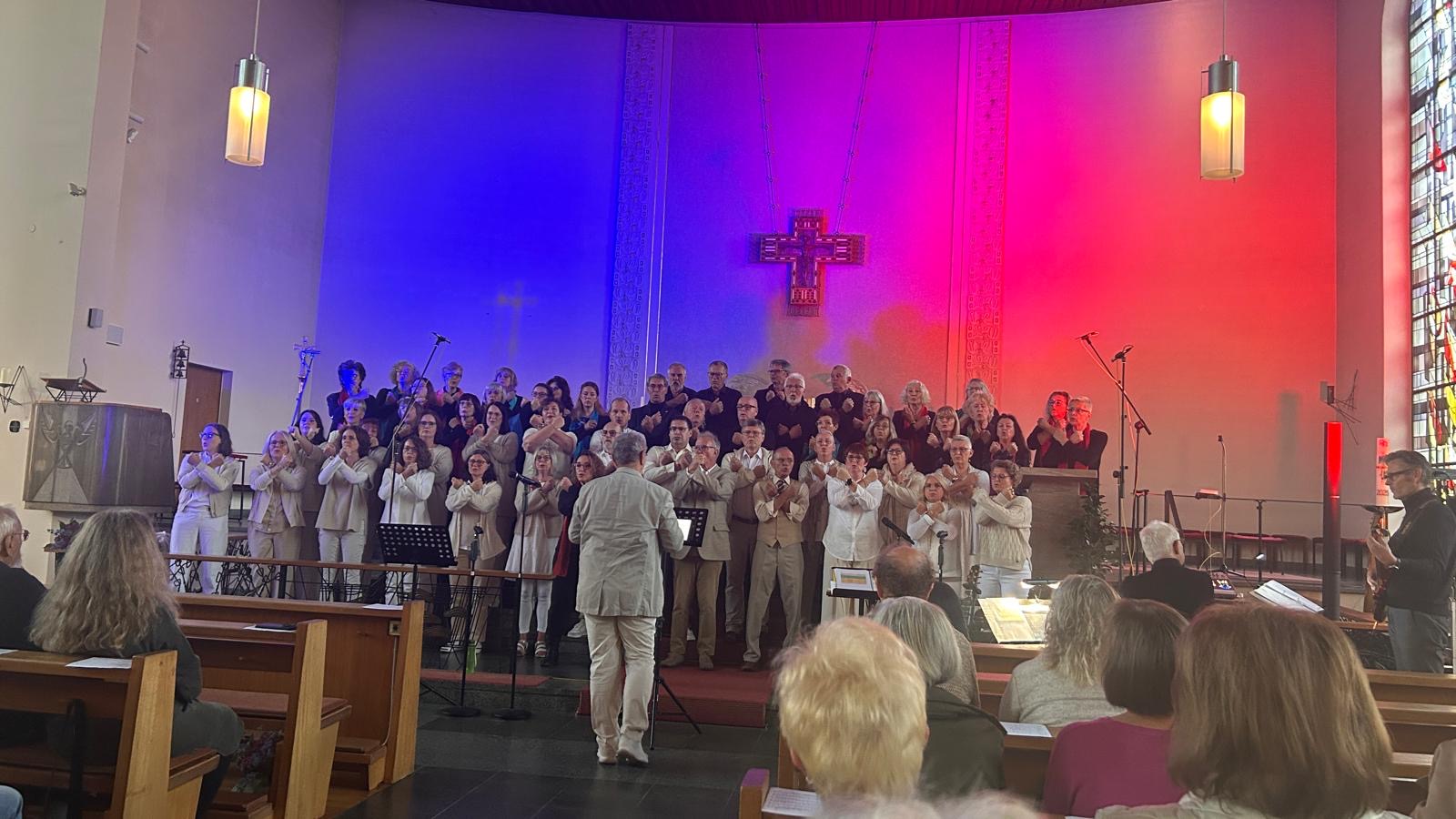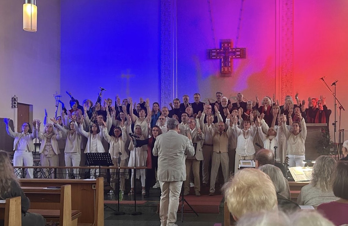 Der Gottesdienst begann mit dem einladenden Lied „Come, Now Is The Time To Worship“, das sowohl von Chor als auch von der Band dargeboten wurde. Die Begrüßung übernahm Katharina Wendler, die die Anwesenden herzlich willkommen hieß und die Vorfreude auf den Abend spürbar machte. Bei den Songs „One Of Us“, „Fix You“, „Seite an Seite“ und „Irgendwas bleibt“ unterstützte der Chor die himmelweit-Band bei den Refrains. Im Song „I Have A Dream“, vom Chor Human Nation dargeboten, ging es um einen Traum für alle Menschen in der Welt von Frieden, Hoffnung und Freiheit, der nichts an seiner Aktualität verloren hat. Besonders berührend war der Solo-Gesang von Gabi Körner-Hillenbrand im Chorstück „Only Hope“, dass die Hoffnung und den Glauben widerspiegelte. Frau Wendler hielt einen inspirierenden Impuls, der die Gemeinde dazu einlud, „Seite an Seite“ zu stehen und gemeinsam zu wachsen. Die Frage „Wann reißt der Himmel auf?“ wurde dabei immer wieder aufgegriffen und regte zum Nachdenken an. Die Band und der Chor setzten die musikalische Reise mit „Irgendwas bleibt“ fort, das mit einem eingängigen „Oh, oh…“-Refrain das Publikum zum Mitsingen animierte. Der Konzert-Gottesdienst fand seinen Abschluss mit dem kraftvollen Lied „Shackles“ (Fesseln) bei dem alle mitklatschten, nach dem Segen von Frau Wendler.