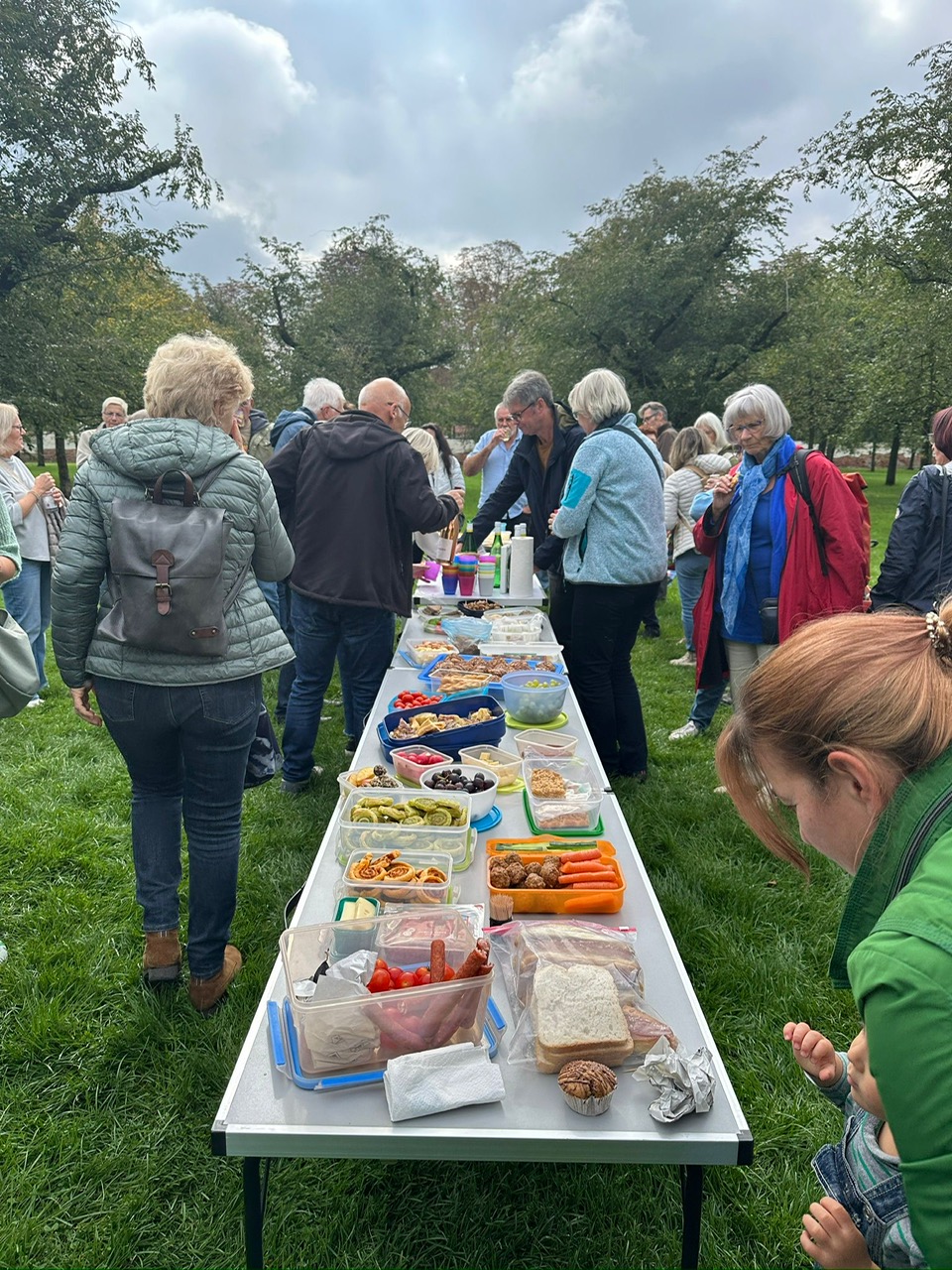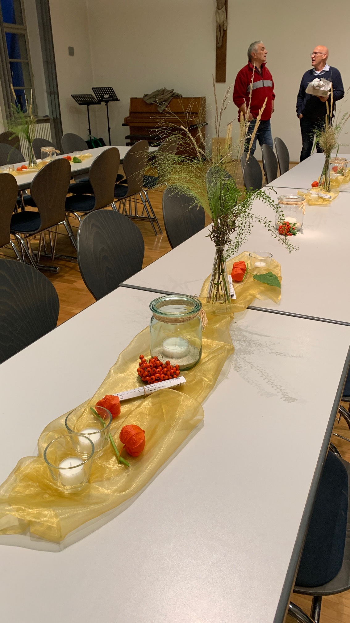 Im Anschluss traf man sich im Pfarrheim zum Sektempfang und anschließend zum Essensbuffet mit selbstgemachten Salaten, Fleischkäse, Gemüsefrikadellen und Dessert. Zwischendurch wurde natürlich fleißig geprobt für das Freundschaftskonzert am nächsten Tag. Die Frauengemeinschaft unterstützte tatkräftig bei der