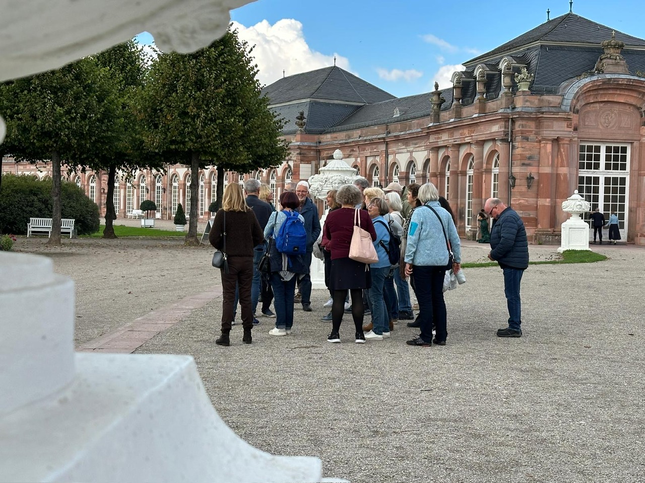 40 Sängerinnen und Sänger sowie Chorleiter Frank Förster aus Unterfranken lernten den weitläufigen Schlossgarten und das Schloss kennen, inklusive einer Schlossführung. Zuvor stärkte man sich nach der Busfahrt im Obstgarten bei der Moschee bei einem Picknick unter freiem Himmel. Nach kurzem Check-in in ein Hotel im Gewerbegebiet in St. Leon-Rot ging es für die „Troubis“ ins Pfarrheim nach Rot, wo die Chormitglieder von Human Nation sie empfingen und zugleich in der Kirche St. Mauritius eine erste Stellprobe stattfand.